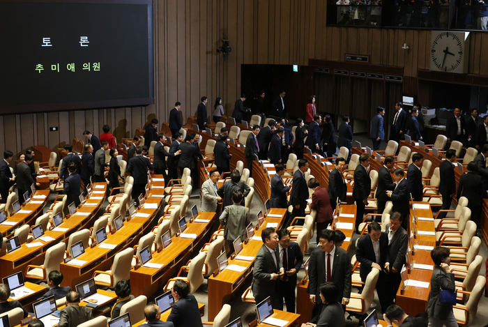 ▲ 국민의힘 의원들이 지난 14일 국회 본회의에서 검건희 여사 특검법이 상정되자 퇴장하고 있다. © 인디포커스
