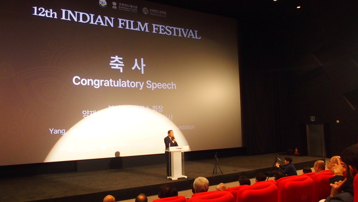 양 회장은 "오늘 개최되는 제12회 인도영화제는 먼 옛날 김수로왕과 그 황후의 만남으로 거슬러 올라가는 깊은 역사를 가진 부산과 인도 간의 문화교류를 더욱 증진하고 두 나라 간의 우호 관계를 한층 더 강화하는 소중하고 귀중한 기회라고 생각한다. 인도는 오랜 역사와 풍부한 문호유산을 자랑하는 위대한 나라이다. 인도영화산업은 세계적으로도 그 규모와 영향력이 매우 크며 인도영화는 다양한 장르와 독특한 스토리텔링으로 많은 사람들의 사랑을 받고 이번 영화제에서 상영되는 작품들은 인도의 풍요로운 사회, 문화, 역사 그리고 사람들의 이야기를 담은 생생한 현장의 모습뿐만 아니라 인도에서도 큰 인기를 끌고 있는 재미있는 작품들로써 우리에게 많은 감동과 잔잔한 영감을 선물해 줄 것이다. 또한 이번 영화제는 양국 간의 비즈니스 비즈니스 및 경제협력을 증진하는 데에도 큰 의미와 시작이 될 것이라 굳게 문화는 사람과 사람을 이어주는 강력한 매개체이며 이를 통해 우리는 더 나은 이해와 협력을 이루어 낼 수 있다. 부산과 인도가 서로 번영을 이루기 위해 함께 손잡고 나아가길 바란다. 이번 인도영화제가 성공적으로 개최될 수 있도록 힘써 주신 모든 분들께 심심한 감사의 말씀을 드린다"고 축사를 했다.