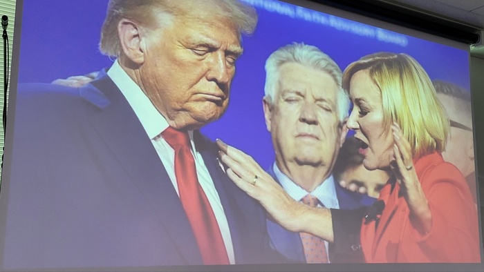 ![]() ▲ 트럼프 미국 대통령 당선인 종교 자문위원인 폴라 목사가 트럼프 당선인에게 기도를 하고 있는 특별 영상 메시지가 스크린에 노출되고 있다 © 김중건 |