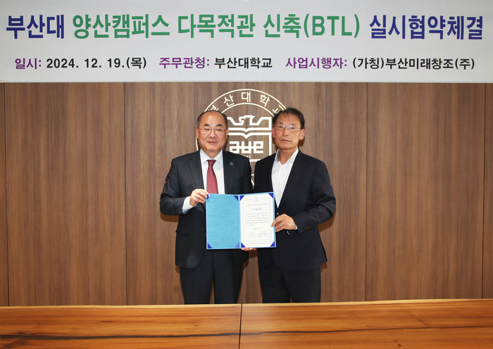 부산대학교(총장 최재원)는 ‘양산캠퍼스 다목적관 신축’의 최종 사업시행자로 선정된 경동건설㈜ 중심의 컨소시엄인 ’(가칭)부산미래창조 주식회사‘와 19일 오후 교내 대학본부 5층 제1회의실에서 임대형 민간투자사업(BTL, Build-Transfer-Lease) 실시협약을 체결했다고 밝혔다.