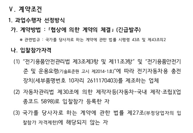 C업체는 충전기 제조 분야에서 가장 대표적인 국내 업체로 같은 환경부 소속인 환경공단 충전기 납품 비리로 제재를 받고 있고. 이번 사업도 충전기 제조 납품 역할로 컨소시엄에 참여하고 있는데 보수적으로 접근 해야될 국가 단체가 법령을 자의적으로 해석하고, 유리한 부분을 적용하여 특정업체에 편의를 봐주고 있다는 것으로 판단되는 부분입니다.