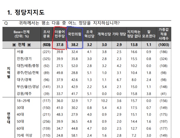 연령대별로는 18~28세(국힘 32.9% vs 민주 36.0%), 30대 (국힘 30.2% vs 민주 41.0%), 40대(국힘 27.9% vs 민주 48.3%), 50대(국힘 36.5% vs 민주 39.9%), 60대(국힘 44.8% vs 민주 34.7%), 70세 이상(국힘 58.1% vs 민주 24.8%)였다.