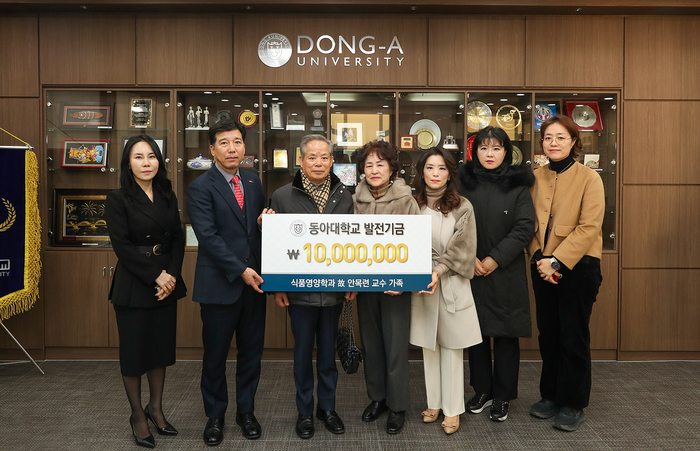 지난 10일 동아대 승학캠퍼스 대회의실에서 열린 장학금 전달식엔 전미라 교무처장을 비롯한 식품영양학과 모든 교수들과 장학생, 故안목련 교수 가족 등이 참석했다. 이날 장학금 전달식에 앞서 故안목련 교수 가족들이 승학캠퍼스 총장실을 방문, 이해우 총장에게 식품영양학과 발전기금 1,000만 원을 전달했다.