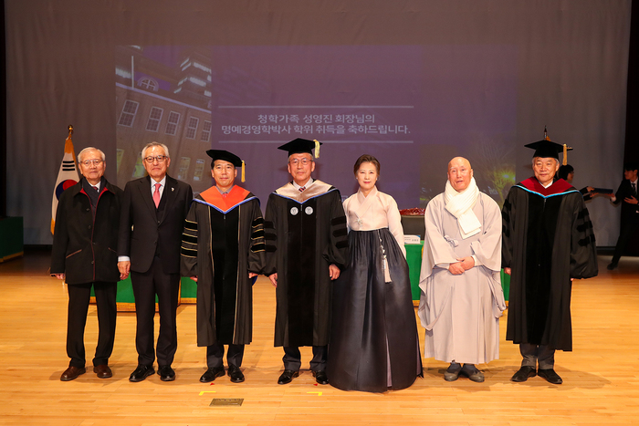 승학캠퍼스 리인홀에서 지난 10일 열린 학위수여식에는 이해우 총장과 성영진 회장, 신정택 총동문회장, 동아대 명예박사회장 성각스님, 학교법인 동아학숙 이사진, 청학가족 임직원, 성 회장 가족 등이 참석해 자리를 빛냈다.