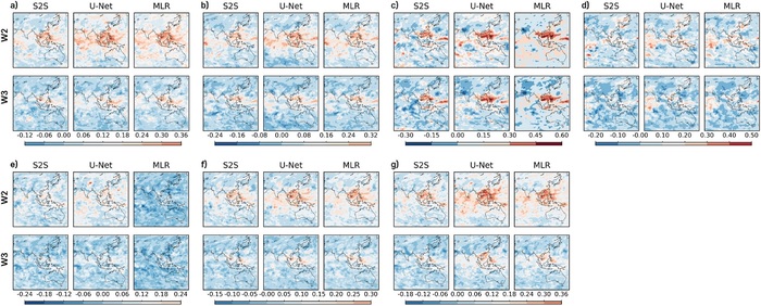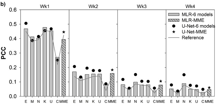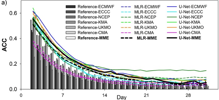 APCC 연구팀은 이러한 계절내 예측의 어려움을 해결하고자 *인공지능 기술인 *딥러닝에 기반한 후처리(Post-Processing)를 통해 2주에서 4주 동안의 동아시아 계절내 다중모델 앙상블 강수 예측의 신뢰성이 높아짐을 확인했다. 딥러닝 기반 후처리란 딥러닝 모델이 지금까지 축적한 계절내 예측 데이터를 바탕으로 장기적인 기상 패턴을 학습 및 예상하고 이를 기반으로 다음 날의 기상 조건을 순차적으로 예측하는 기법이다.