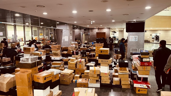 ▲ 22일 국회 본관에도 오후에 배달된 각종 선물들을 정리 하는 국회 직원들 © 김병건