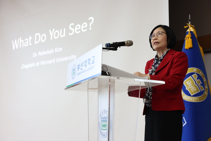 ▲ 부산대학교(총장 최재원)는 17일 교내 대학본부 5층 제1회의실에서 미국의 NGO(비정부기구) 단체인 The Seed of Hope Foundation(SOH)과 글로벌 협력 강화를 위한 업무협약(MoU)을 체결했다 레베카 김 대표가 특강을 하고 있다 ©김중건