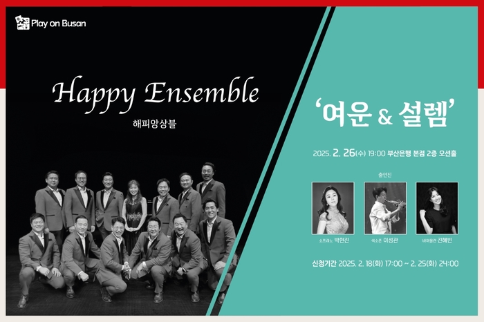 오는 26일(수) 오후 7시부터 부산은행 본점 2층 오션홀에서 열리는 이번 음악회에는 부산에서 활동하는 남성성악가 12인조로 구성된 해피앙상블의 무대와 더불어 소프라노 박현진, 바이올리니스트 진혜빈, 색소폰 연주자 이성관 등이 특별 출연해 겨울의 여운과 봄의 설렘을 담은 다채로운 프로그램으로 관객들을 만날 예정이다.