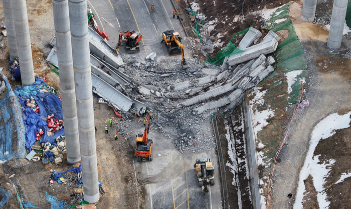 ▲ 25일 경기도 안성시 서운면 산평리 소재 서울세종고속도로 천안~안성구간 9공구 천용천교 건설 현장에 교량 위에서 떨어진 상판들이 파괴되어 있다. 2025.2.25. 연합뉴스 © 인디포커스