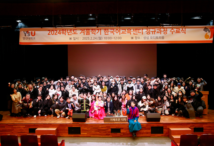 와이즈유 영산대학교(총장 부구욱) 한국어교육센터가 지난 24일 오전 10시 부산시 해운대구 반송동 대학 해운대캠퍼스 성심 오디토리움에서 외국인 유학생의 ‘겨울학기 정규과정 수료식’을 진행했다.