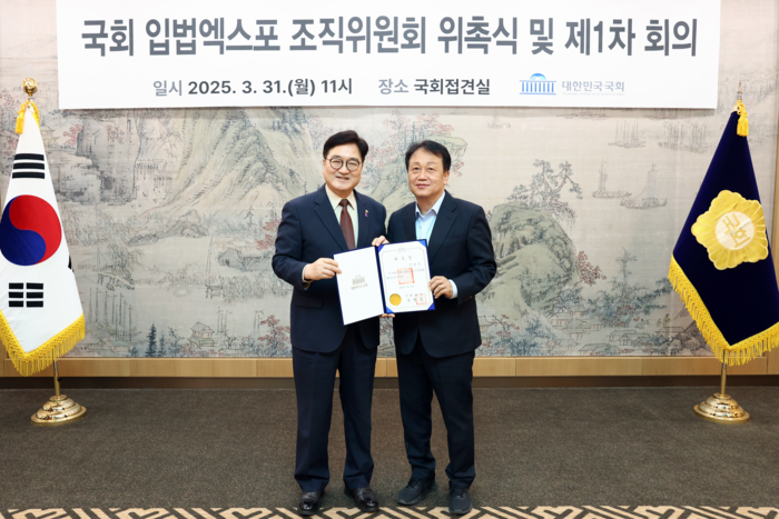 ![]() ▲ 국회 입법엑스포 조직위원회 위원 위촉식. 우원식 국회의장(좌) 민병두 조직위원장(우). 2025.3.31 [국회의장실] |
