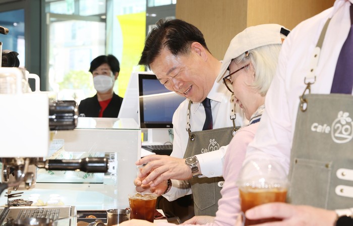 ![]() ▲ 박승원 광명시장이 지난해 4월 광명시인생플러스센터 1층에 문을 연‘카페(CAFE)-20'에서 시니어 바리스타와 함께 커피를 내리고 있다. © 광명시 |