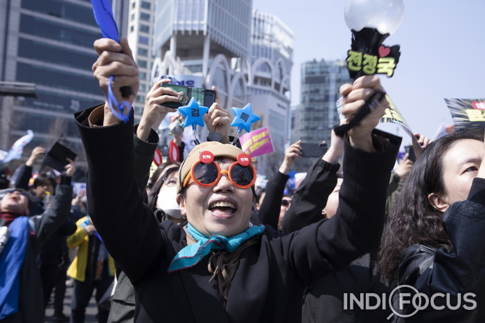 ▲ 윤석열 대통령 탄핵 심판 선고일인 4일 오전 안국동사거리에서 헌법재판소 방향 율곡로에서 헌법재판소가 재판관 전원 일치로 윤석열 대통령을 파면한다고 밝히자 탄핵찬성 시민들은 환호성을 외쳤다. © 김한솔 기자