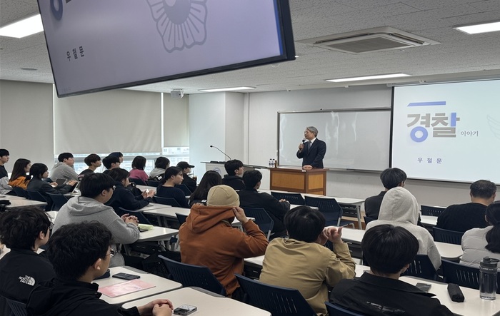 ‘경찰 이야기’라는 주제의 이날 특강에서 우철문 전 청장은 경찰 재임 시절의 다양한 에피소드를 통해 경찰 업무의 현실을 생동감 있게 전달했다. 또 우리나라의 경찰 제도와 치안 여건에 대한 풍부한 분석을 공유, 학생들에게 경찰학 분야에 대한 폭넓은 지식을 전달했다.