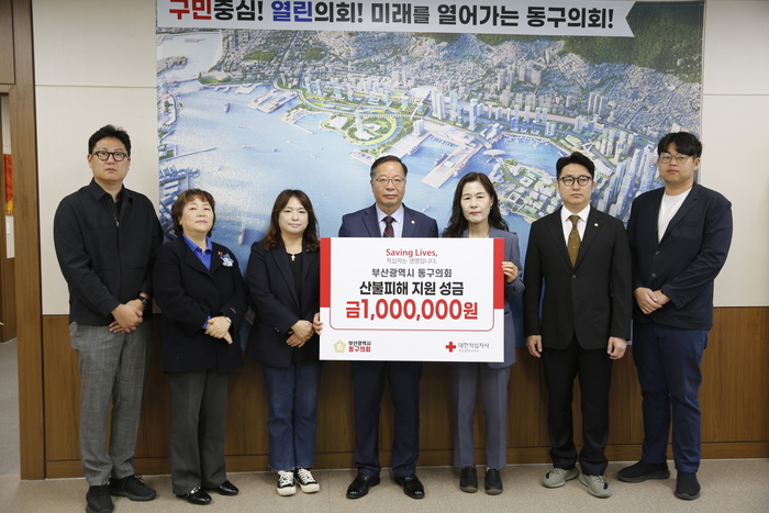 부산 동구의회(의장 안종원)가 10일 최근 영남 지역을 비롯해 전국적으로 확산된 대형 산불 피해 이재민을 돕기 위해 성금 100만원을 대한적십자사 부산지사(회장 서정의)에 전달했다.
