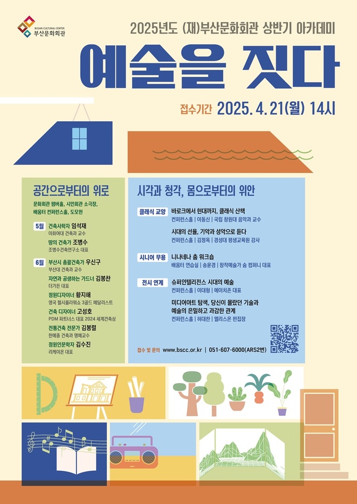 (재)부산문화회관은 2025년도 상반기 아카데미 프로그램 <예술을 짓다>를 통해 ‘공간으로부터의 위로’, ‘시각과 청각, 몸으로부터의 위안’이라는 두 개의 테마로 총 13개의 강좌를 선보인다. 이번 아카데미에서 건축, 조경, 음악, 미술, 무용 등 다양한 장르들을 만나며, 예술이 가진 치유의 힘과 회복력을 통해 일상의 소중함을 발견하는 특별한 시간을 제공할 예정이다.