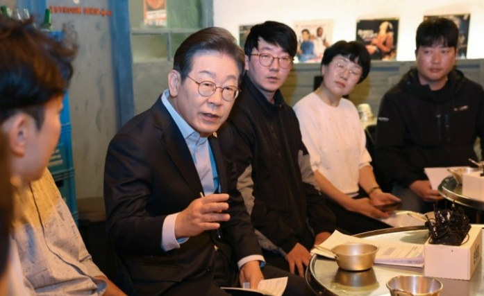 ![]() ▲ 비(非)전형 노동자들과 간담회 하는 이재명 민주당 대선후보. (사진 = 연합뉴스) |