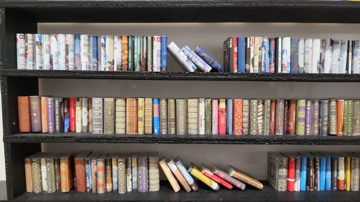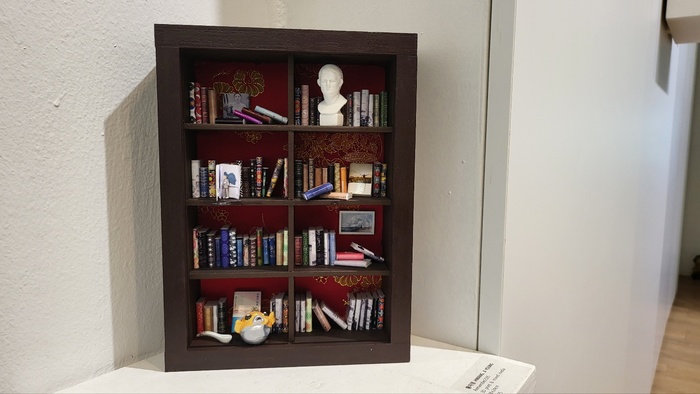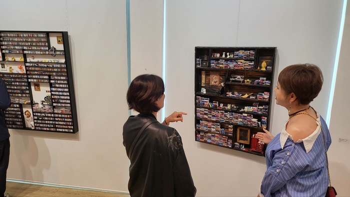 작가의 작업은 단순히 옛 것을 재현하는 데 그치지 않는다. 그녀는 오랜 시간 전통 민화의 조형성을 연구하며, 3D 프린터를 활용한 현대적 조형기법과 미니어처 공예 기법을 결합해 독창적인 ‘입체 책가도’라는 장르를 개척했다. 입체화된 책장 속에는 손톱만 한 크기의 책들이 한 권 한 권 정교하게 꽂혀 있다. 놀라운 점은 그 작은 책들에 각각 제목이 또렷하게 적혀 있다는 것이다. 마치 활자로 인쇄한 듯한 정밀함은 관람객으로 하여금 작가의 꼼꼼한 집념과 예술에 대한 태도를 엿보게 한다.