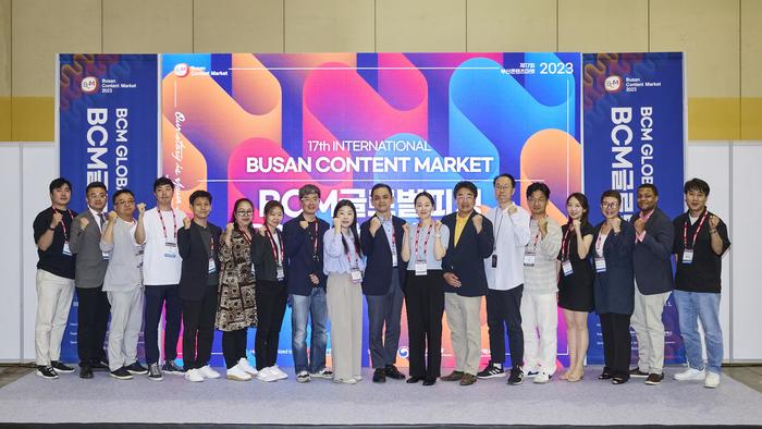 ▲ ▲ 제 17회 부산콘텐츠마켓(BCM) 2023 글로벌 피칭에서 콘텐츠 피칭을 진행한 드라마/애니메이션/지역강소제작사 부문의 11개 업체가 단체 사진을 촬영하고 있다. ©김중건