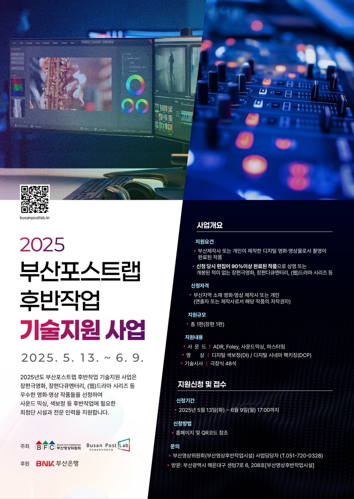 부산영상위원회(운영위원장 강성규)가 운영하는 부산영상후반작업시설이 부산에서 제작된 우수 콘텐츠를 대상으로 ‘2025 부산포스트랩 후반작업 기술지원 사업’을 실시한다.