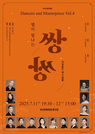 부산시립무용단, 특별공연 이정윤의 댄스살롱 ‘별이 빛나는 <쌍쌍>’ 선보인다- 7월 11일(금) 19:30 ~ 12일(토) 15:00, 부산문화회관 중극장 -부산시립무용단(예술감독 이정윤)은 오는 7월 11일(금)과 12일(토) 양일간 부산문화회관 중극장에서 특별공연 이정윤의 댄스살롱 ‘별이 빛나는 <쌍쌍>’을 선보인다.