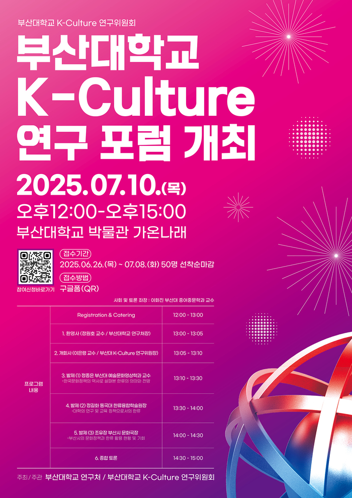 ‘K-Culture(컬처)’는 해양기후 테크, 방위산업 등과 함께 부산대가 세계적 수준으로 집중 육성하고 있는 10대 연구 분야 중 하나다. 이번 포럼은 부산대가 연내를 목표로 K-Culture 연구소 설립을 준비하고자, K-Culture를 역사·문학·철학·예술 등 한국의 전통과 현대를 연결하는 학문적 플랫폼으로 발전시키기 위한 학술·정책 융합의 장으로 마련됐다. 이 행사는 부산대 연구처와 K-Culture 연구위원회가 공동 주관한다.