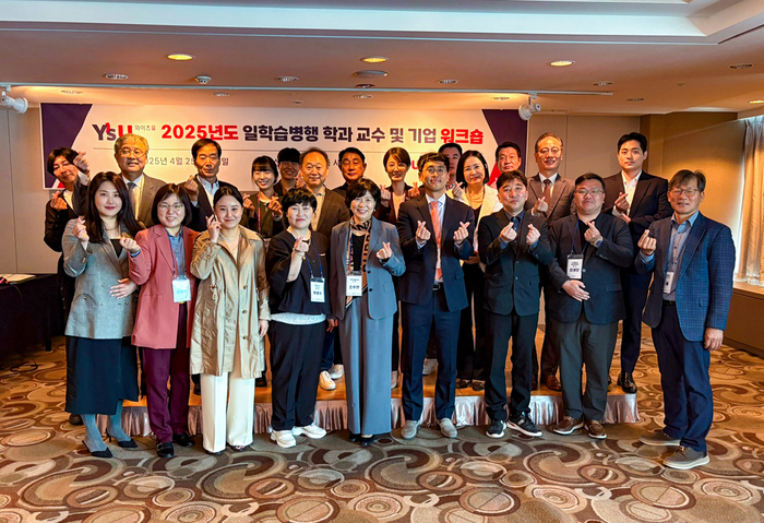 ▲ 와이즈유 영산대학교가 일학습병행 학과교수, 기업 워크숍을 진행하고 기념촬영을 하고 있다 ©김중건