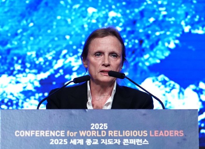 ▲ 2025 세계 종교 지도자 컨퍼런스에서 기조연설을 하는 패트리샤 듀발 국제인권 변호사 © 김중건