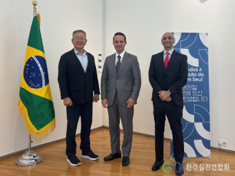 ![]() ▲ 왼쪽부터 환경실천연합회 이경율 회장, UNICA 대표 단장 Evandro Gussi 박사, 주한브라질대사관 Flavio Melo 참사관이 기념 촬영을 하고 있다. [사진=환경실천연합회] © 인디포커스 김은해 기자 |