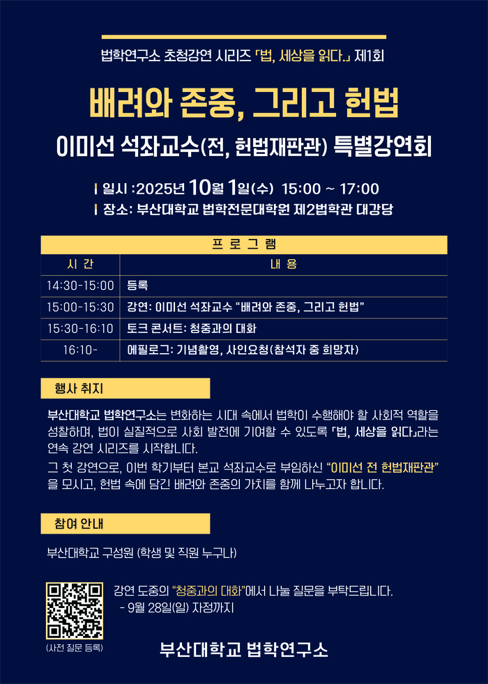 김현수 법학연구소장(법학전문대학원 교수)은 “이번 초청 강연은 부산대 법학연구소가 새롭게 마련한 「법, 세상을 읽다」 시리즈의 출발점으로, 법이 단순한 규율을 넘어 사회 속에서 배려와 존중의 가치를 구현하는 데 어떠한 역할을 할 수 있는지 함께 고민하는 자리”라며 “특히 우리 사회의 헌법적 가치와 그 실천을 오랜 기간 탐구해 오신 이미선 전 헌법재판관을 모셔 강연을 듣게 된 것은 큰 의미가 있다. 이번 강연이 법학적 성찰과 더불어 대학 구성원 모두가 헌법의 정신을 삶 속에서 새롭게 발견하고 공유하는 계기가 되기를 기대한다”고 전했다.