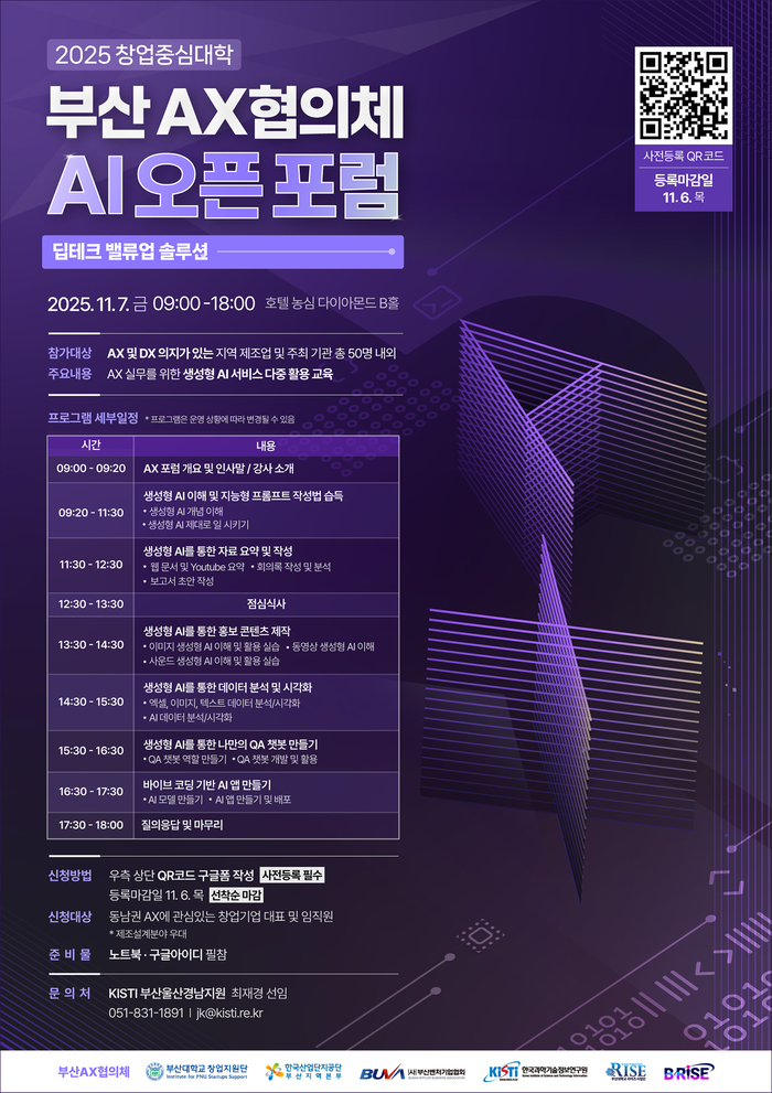 창업중심대학 사업을 수행 중인 부산대학교(총장 최재원) 창업지원단은 부산AX협의체와 함께 AX(AI Transformation, 인공지능 전환)에 관심 있는 예비 창업자 및 창업기업 임직원을 대상으로 「제3회 부산AX협의체 AI오픈포럼」을 오는 7일 오전 9시부터 오후 6시까지 부산 호텔 농심 다이아몬드홀에서 개최한다고 밝혔다.