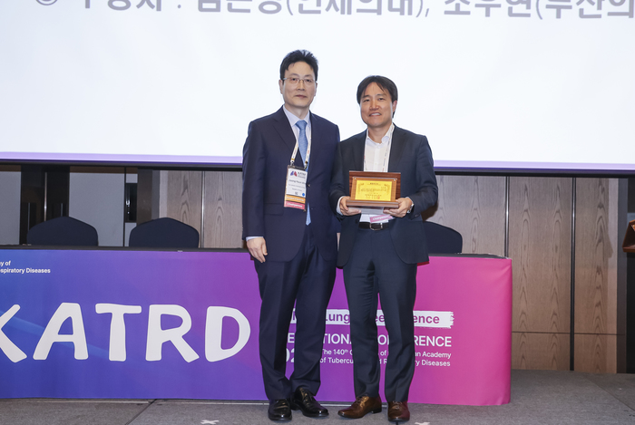 ▲ 양산부산대병원 호흡기내과 조우현(사진 오른쪽) 교수가 대한결핵 및 호흡기학회 국제학술대회(KATRD 2025)에서 융합의학상 수상 후 기념촬영을 하고 있다 © 김중건