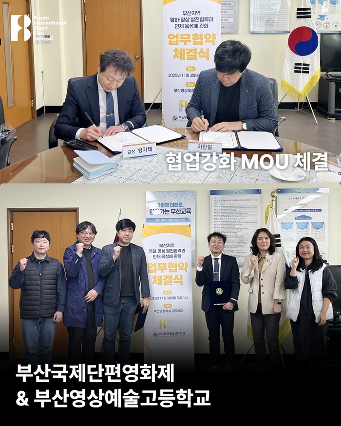 (사)부산국제단편영화제와 부산영상예술고등학교는 지난 11월 3일(월) 부산국제단편영화제 차민철 이사장과 부산영상예술고등학교 성기태 교장과 박미나 교감이 참석하여 상호업무협약(MOU)을 체결했다. 부산국제단편영화제는 앞서 양산인공지능고등학교와의 협약을 통해 AI 기반 영화·영상 교육 협력 체계를 다진 데 이어, 이번 부산영상예술고등학교와의 협약으로 청소년 영화 교육과 단편영화 창작 생태계 확대에 더욱 속도를 높이게 되었다.
