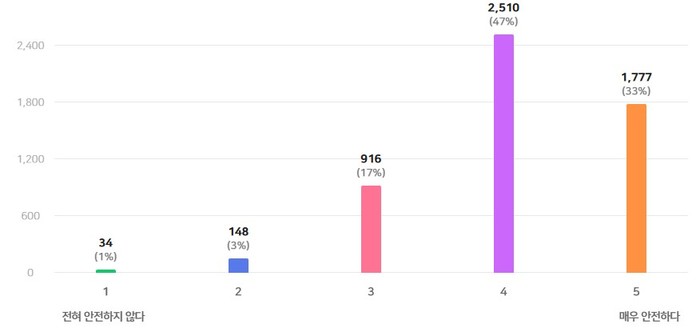 이번 조사에서 ‘거주 지역이 안전하다고 느끼는지’라는 질문에 대해 ‘매우 안전하다’는 35%, ‘안전하다’는 46%, ‘보통이다’는 16%, ‘안전하지 않다’는 3%, ‘전혀 안전하지 않다’는 1%로 나타났다.
