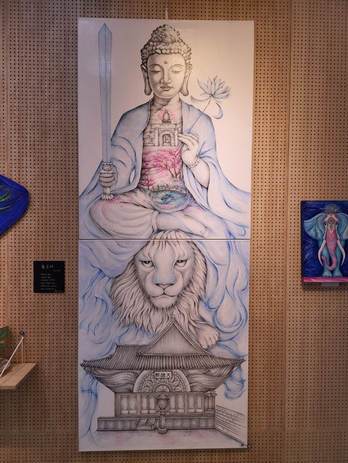 태자 시절 부처님의 초상화·부처님의 향기를 담은 '통도사', 어린 소녀의 뒷모습 등 그림 40여점과 버닝아트 30여점, 머그컵 티 스푼, 찻잔, 접시 등 다양한 도자·나무 소품 다수가 전시돼 있다.
