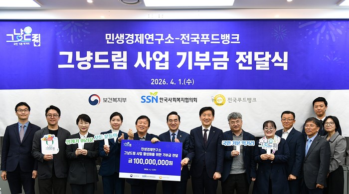 민생경제연구소, 전국푸드뱅크 ‘그냥드림’ 사업에 1억 원 기부- 기획예산처 박홍근 장관, 보건복지부 유주헌 사회서비스정책관, 민생경제연구소 안진걸 소장 등 참여민생경제연구소가 지난 1일 서울 마포구에서 열린 기부금 전달식에서 전국푸드뱅크의 ‘그냥드림’ 사업에 1억 원을 기부했다. 이번 기부는 복지 사각지대에 놓인 소외계층의 먹거리 기본권을 보장하기 위해 마련된 것으로, 기획예산처 박홍근 장관과 보건복지부 유주헌 사회서비스정책관 등이 자리를 함께했다.