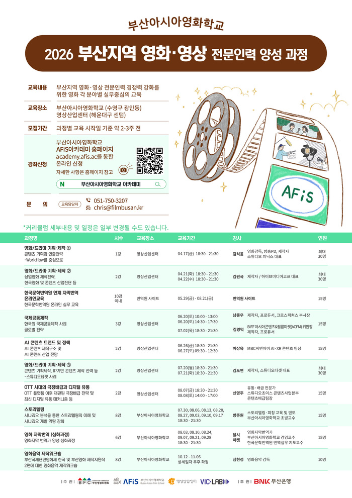 세부 일정 및 신청 방법은 부산영상위원회 공식 홈페이지 공지사항 또는 부산아시아영화학교 온라인 교육 플랫폼 AFiS아카데미 오프라인 강좌에서 확인할 수 있다.