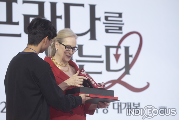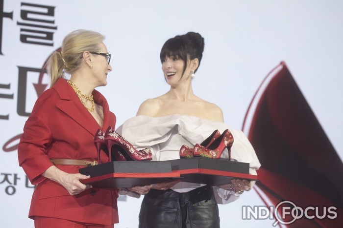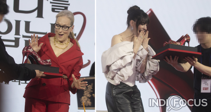 【인디포커스=김한솔 기자】 배우 메릴 스트립과 앤 해서웨이가 8일 오전 서울 종로구 한 호텔에서 열린 영화 <악마는 프라다를 입는다 2> 내한 기자간담회에서 꽃신형 하이힐을 선물로 받자 놀라운 표정을 짓는다.